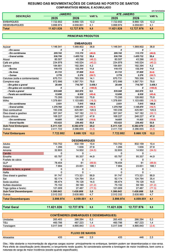 Em janeiro de 2026, foram movimentadas 12,7 milhões de toneladas de cargas no Porto de Santos. O número é 9,5% maior que o de 2025 (11,6 milhões) e 6,8% maior que o recorde anterior (2024, quando foram 11,9 milhões).